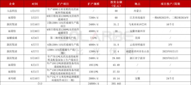 從上半年公布的光伏玻璃擴(kuò)產(chǎn)信息來(lái)看,玉晶科技、福萊特、旗濱集團(tuán)、福耀玻璃、亞瑪頓共計(jì)發(fā)布了超24800t/d(噸/日)玻璃擴(kuò)產(chǎn)信息。然而,更多光伏玻璃擴(kuò)產(chǎn)項(xiàng)目處于聽(tīng)證階段。