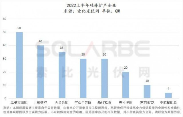 其中,高景太陽(yáng)能擴(kuò)產(chǎn)50GW直拉單晶硅棒,其次為上機(jī)數(shù)控?cái)M建年產(chǎn)40GW單晶硅拉晶及配套生產(chǎn)項(xiàng)目,還有天合光能年產(chǎn)35GW的直拉單晶項(xiàng)目。