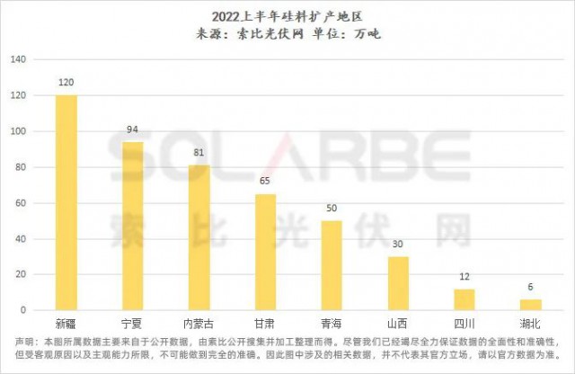 ●為填補(bǔ)供應(yīng)缺口,2022年上半年,有不少于19家企業(yè)發(fā)布硅料擴(kuò)產(chǎn)計(jì)劃,擴(kuò)產(chǎn)總量達(dá)458萬(wàn)噸(多晶硅269萬(wàn)噸,工業(yè)硅189萬(wàn)噸),投資金額超1620億,擴(kuò)產(chǎn)多集中在新疆、內(nèi)蒙古、寧夏、四川等地。
