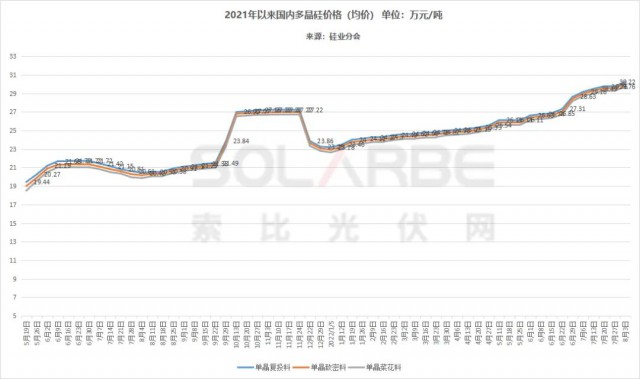 這一勢(shì)頭也為硅料環(huán)節(jié)敲響了警鐘,2021年中,供需失衡導(dǎo)致硅料價(jià)格不斷暴漲至今,單晶復(fù)投料從去年年初的8.76萬(wàn)元/噸,到今天30.22萬(wàn)元/噸,漲幅245%;單晶致密料從8.5萬(wàn)元/噸到30萬(wàn)元/噸,漲幅253%;單晶菜花料從8.2萬(wàn)元/噸到29.72萬(wàn)元/噸,漲幅262%。
