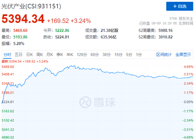 8月9日,調(diào)整一周有余的光伏板塊迎來全線反彈,個股呈現(xiàn)普漲態(tài)勢,中證光伏產(chǎn)業(yè)指數(shù)(CSI:931151)大漲3.24%,報收5394點。值得注意的是,近幾個交易日股價表現(xiàn)強勢的部分電池片概念股早盤出現(xiàn)沖高回落的情況,而近期股價表現(xiàn)較為萎靡的硅片等產(chǎn)業(yè)鏈上游個股卻集體大漲。