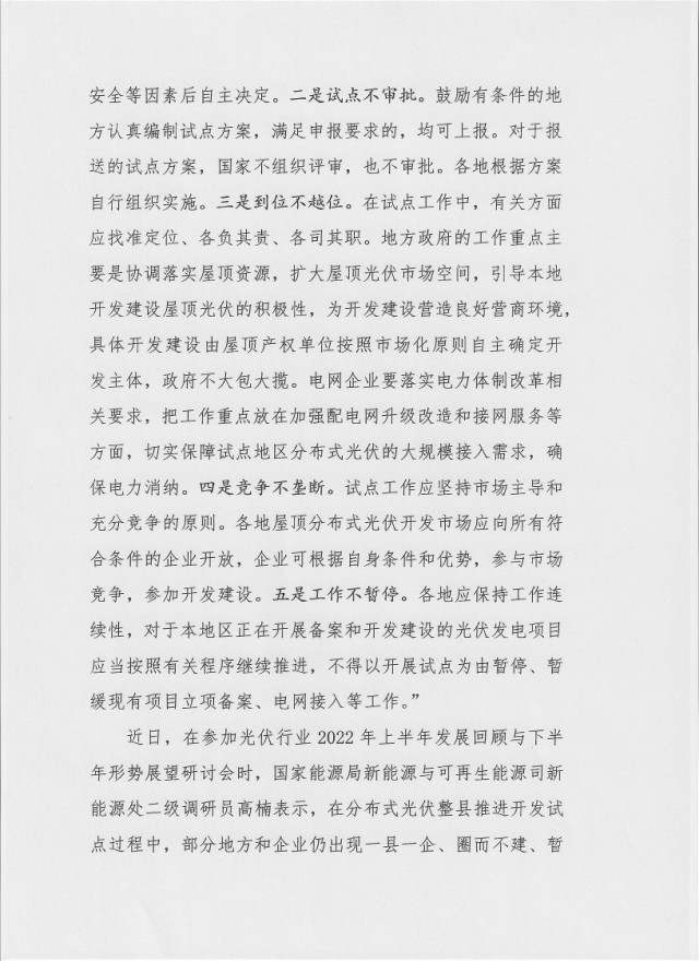 啟動(dòng)整縣(市、區(qū))推進(jìn)屋頂分布式光伏開發(fā)試點(diǎn)工作,主要目的就是充分調(diào)動(dòng)和發(fā)揮地方積極性,引導(dǎo)地方政府協(xié)調(diào)更多屋頂資源,進(jìn)一步開拓市場(chǎng),擴(kuò)大屋頂分布式光伏的建設(shè)規(guī)模。去年,國(guó)家能源局提出“在開展整縣(市、區(qū))推進(jìn)屋頂分布式光伏開發(fā)試點(diǎn)工作中需要著重把握以下五個(gè)方面:一是自愿不強(qiáng)制。各地是否開展試點(diǎn)以及開展多少個(gè)試點(diǎn)由各地根據(jù)自身實(shí)際情況自己決定,不搞行政命令。建筑屋頂是否開展建設(shè),由屋頂產(chǎn)權(quán)單位綜合考慮屋頂承重、安全等因素后自主決定。二是試點(diǎn)不審批。鼓勵(lì)有條件的地方認(rèn)真編制試點(diǎn)方案,滿足申報(bào)要求的,均可上報(bào)。對(duì)于報(bào)送的試點(diǎn)方案,國(guó)家不組織評(píng)審,也不審批。各地根據(jù)方案自行組織實(shí)施。三是到位不越位。在試點(diǎn)工作中,有關(guān)方面應(yīng)找準(zhǔn)定位、各負(fù)其責(zé)、各司其職。地方政府的工作重點(diǎn)主要是協(xié)調(diào)落實(shí)屋頂資源,擴(kuò)大屋頂光伏市場(chǎng)空間,引導(dǎo)本地開發(fā)建設(shè)屋頂光伏的積極性,為開發(fā)建設(shè)營(yíng)造良好營(yíng)商環(huán)境,具體開發(fā)建設(shè)由屋頂產(chǎn)權(quán)單位按照市場(chǎng)化原則自主確定開發(fā)主體,政府不大包大攬。電網(wǎng)企業(yè)要落實(shí)電力體制改革相關(guān)要求,把工作重點(diǎn)放在加強(qiáng)配電網(wǎng)升級(jí)改造和接網(wǎng)服務(wù)等方面,切實(shí)保障試點(diǎn)地區(qū)分布式光伏的大規(guī)模接入需求,確保電力消納。四是競(jìng)爭(zhēng)不壟斷。試點(diǎn)工作應(yīng)堅(jiān)持市場(chǎng)主導(dǎo)和充分競(jìng)爭(zhēng)的原則。各地屋頂分布式光伏開發(fā)市場(chǎng)應(yīng)向所有符合條件的企業(yè)開放,企業(yè)可根據(jù)自身?xiàng)l件和優(yōu)勢(shì),參與市場(chǎng)競(jìng)爭(zhēng),參加開發(fā)建設(shè)。五是工作不暫停。各地應(yīng)保持工作連續(xù)性,對(duì)于本地區(qū)正在開展備案和開發(fā)建設(shè)的光伏發(fā)電項(xiàng)目應(yīng)當(dāng)按照有關(guān)程序繼續(xù)推進(jìn),不得以開展試點(diǎn)為由暫停、暫緩現(xiàn)有項(xiàng)目立項(xiàng)備案、電網(wǎng)接入等工作。”