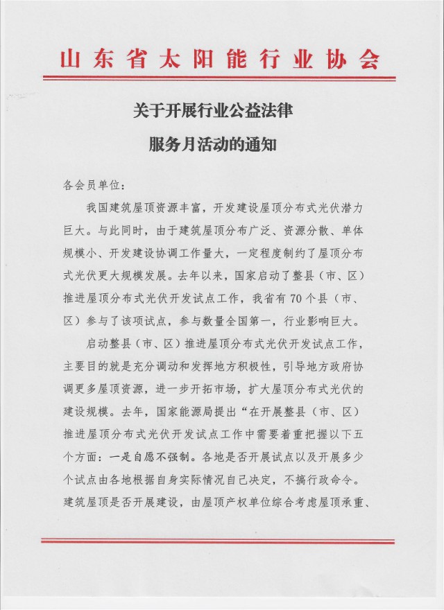 上述“一縣一企、圈而不建、暫停備案”等問題的存在,也嚴(yán)重影響了我省太陽能光伏行業(yè)企業(yè)、尤其是分布式光伏開發(fā)企業(yè)的健康穩(wěn)定發(fā)展。為進(jìn)一步維護(hù)行業(yè)企業(yè)權(quán)益、提高行業(yè)企業(yè)法律意識(shí)、推動(dòng)行業(yè)健康穩(wěn)定可持續(xù)發(fā)展,山東省太陽能行業(yè)協(xié)會(huì)擬于近期開展會(huì)員法律服務(wù)月活動(dòng),聘請(qǐng)國(guó)家級(jí)權(quán)威法律服務(wù)機(jī)構(gòu)為行業(yè)企業(yè)答疑解惑,并集中開展行業(yè)公益法律服務(wù)進(jìn)企業(yè)活動(dòng),合法維護(hù)會(huì)員權(quán)利。