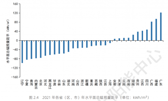 全國(guó)年水平面總輻照量距平分布有地區(qū)性差異,總體來(lái)看,北方地區(qū)較常年偏低,南方地區(qū)較常年偏高。各省與往年平均水平相比的差距如下圖所示。