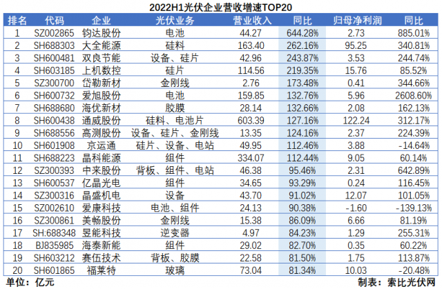 2022年上半年,79家光伏企業(yè)合計創(chuàng)收5571億元,平均增速(“平均”指“中位數(shù)”,下同)達到48%。令人欣喜的是,營收負增長的企業(yè)占比僅為10%,而營收增速超過40%的企業(yè)占比則高達71%。其中,除了硅料企業(yè)繼續(xù)保持高速增長以外,眾多“跨界者”也乘著光伏行業(yè)的“東風”,迎來暴發(fā)式增長。