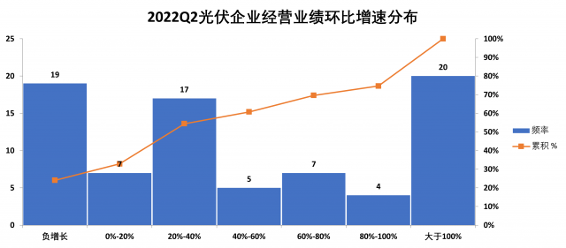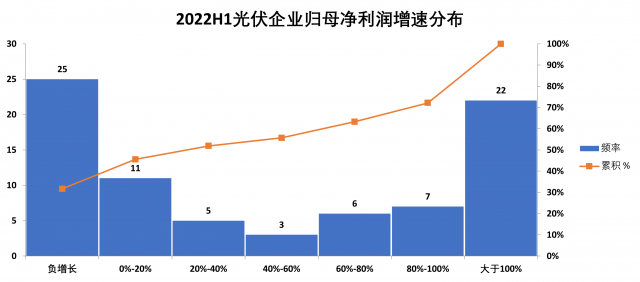 相比于營收的普漲態(tài)勢,光伏企業(yè)的經(jīng)營業(yè)績卻出現(xiàn)顯著分化。2022年上半年,79家光伏企業(yè)的歸母凈利潤總額達到650億元,平均增速為32%。其中,利潤負增長的企業(yè)占比高達32%,而業(yè)績翻倍增長的企業(yè)占比亦達到28%,呈現(xiàn)顯著的“兩極分化”態(tài)勢。不過,與2021年不同的是,產(chǎn)業(yè)鏈中游的諸多專業(yè)化廠商紛紛迎來“困境反轉(zhuǎn)”,而業(yè)績出現(xiàn)下滑的企業(yè)多為競爭力一般的中小市值企業(yè)。