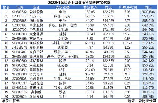 利潤增速方面,除了硅料企業(yè)延續(xù)高增長以外,去年因硅料價格暴漲而出現(xiàn)虧損的產(chǎn)業(yè)鏈中游專業(yè)化廠商,2022年上半年受益于供應(yīng)鏈管理能力的提升以及產(chǎn)品結(jié)構(gòu)的優(yōu)化,紛紛迎來困境翻轉(zhuǎn),其中愛旭股份、東方日升、中來股份的利潤增速分別達到2609%、958%和643%。此外,岱勒新材、東尼電子兩大金剛線廠商受益于硅片環(huán)節(jié)的擴產(chǎn)以及細線化發(fā)展趨勢,疊加自身的產(chǎn)能擴張和成本下降,利潤增速均超300%。