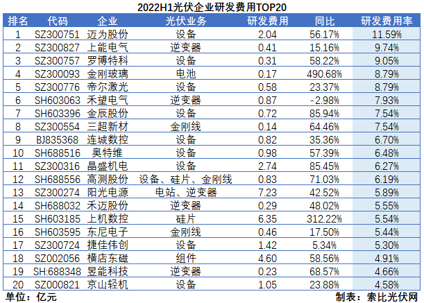 當然,N型電池技術(shù)之所以能夠不斷取得突破性進展,離不開生產(chǎn)設(shè)備的持續(xù)升級與迭代。在研發(fā)費用率排名中,前20位中有10家是設(shè)備廠商,其中HJT設(shè)備龍頭邁為股份的研發(fā)費用率更是高達11.59%。在近期的中報業(yè)績交流會中,邁為股份表示預(yù)計今年下半年HJT組件成本能夠與PERC組件持平,至2023年HJT電池片成本優(yōu)勢將會逐步顯現(xiàn)。