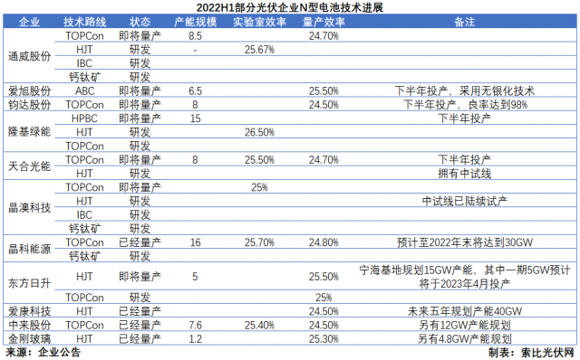 除了盈利能力以及經(jīng)營業(yè)績顯著改善以外,電池片環(huán)節(jié)的N型電池技術(shù)變革也成為了時下業(yè)界以及資本市場關(guān)注的焦點。2022年上半年,TOPCon、HJT乃至鈣鈦礦等電池片概念成為A股市場炒作的熱點,期間更是誕生了寶馨科技、京山輕機、金剛玻璃等一眾“妖股”。而在中報中,各大龍頭企業(yè)也重點披露了N型電池技術(shù)的進展情況。