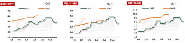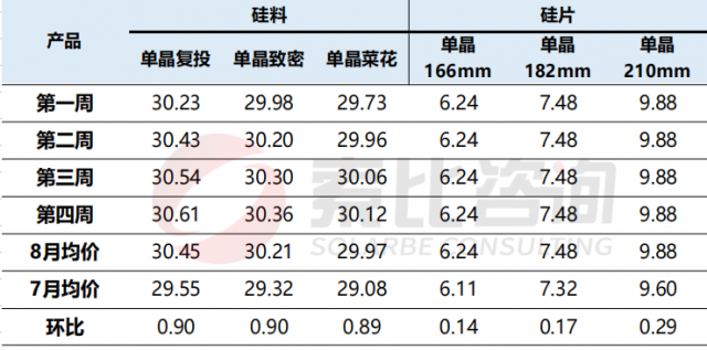 根據(jù)索比咨詢對(duì)多家硅片制造商的調(diào)研:就8月硅片價(jià)格行情來(lái)看,單晶166mm均價(jià)漲至6.24元/片,較7月環(huán)比上升2.1%;單晶182mm均價(jià)漲至7.48元/片,較7月環(huán)比上漲2.2%;單晶210mm均價(jià)漲至9.88元/W,較7月環(huán)比上升2.9%。