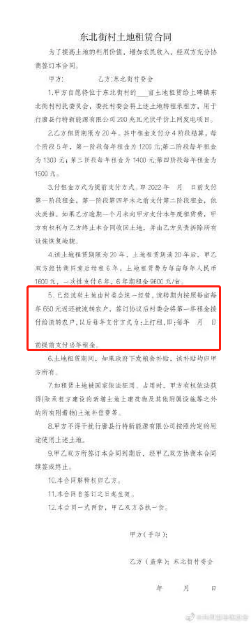 但是根據(jù)一份在網(wǎng)絡(luò)上流傳、未簽訂土地租賃合同文件,“已經(jīng)流轉(zhuǎn)土地由村委會(huì)統(tǒng)一經(jīng)營(yíng),流轉(zhuǎn)期內(nèi)按照每畝每年660元返還被流轉(zhuǎn)農(nóng)戶”。