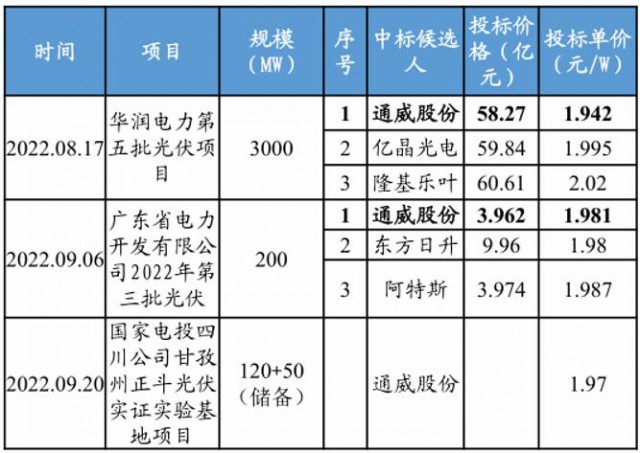今年8月17日,通威成為華潤(rùn)電力3GW集采大單第一中標(biāo)候選人,間隔不到一個(gè)月,9月6日,通威又以第一中標(biāo)候選人中標(biāo)廣東省電力開(kāi)發(fā)有限公司將近4億元的組件大單。