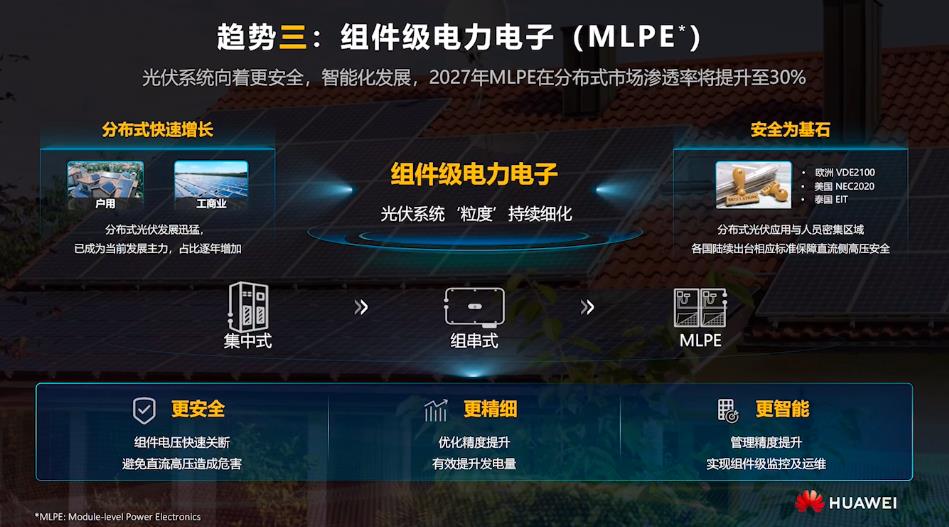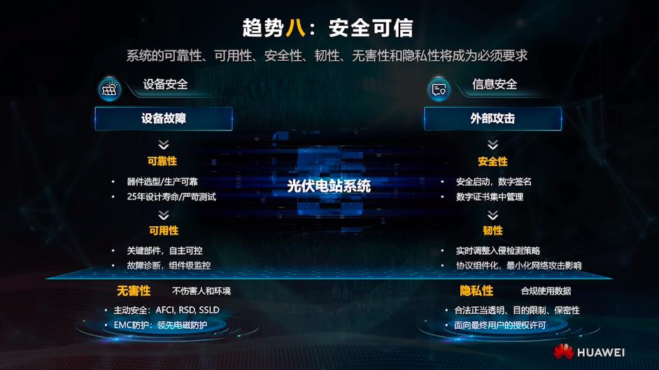 華為此次重磅發(fā)布涵蓋智能光儲發(fā)電機、組串式儲能、電芯級精細管理、安全可信、全面數字化、AI增效等在內的十大趨勢,展望和引領光伏行業(yè)的未來發(fā)展趨勢,通過技術創(chuàng)新實現(xiàn)電網增強、安全可靠、高效運維等,推動光伏成為未來的主力能源。