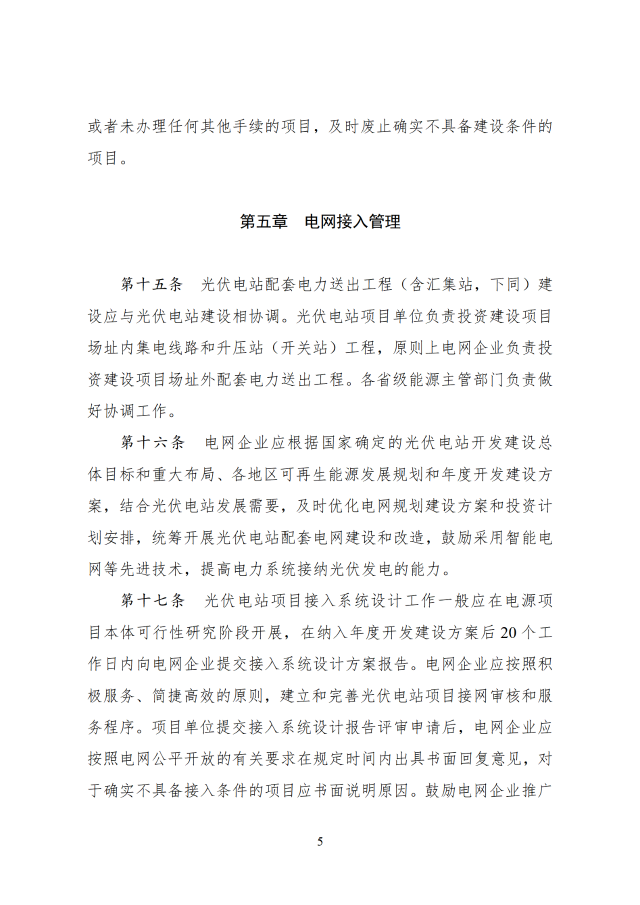 省級(jí)能源主管部門(mén)負(fù)責(zé)做好本省(區(qū)、市)可再生能源發(fā)展規(guī)劃與國(guó)家能源、可再生能源、電力等發(fā)展規(guī)劃和重大布局的銜接,根據(jù)本省(區(qū)、市)可再生能源發(fā)展規(guī)劃、非水電可再生能源電力消納責(zé)任權(quán)重以及電網(wǎng)接入與消納條件等,制定光伏電站年度開(kāi)發(fā)建設(shè)方案。涉及跨省跨區(qū)外送消納的光伏電站,相關(guān)送受端省(區(qū)、市)能源主管部門(mén)在制定可再生能源發(fā)展規(guī)劃、年度開(kāi)發(fā)建設(shè)方案時(shí)應(yīng)充分做好銜接。