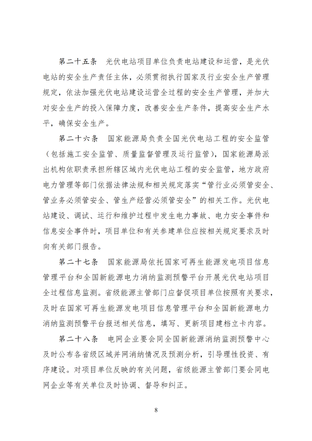 12月26日,國(guó)家能源局印發(fā)關(guān)于《光伏電站開(kāi)發(fā)建設(shè)管理辦法》的通知,通知提到,國(guó)家能源局負(fù)責(zé)全國(guó)光伏電站開(kāi)發(fā)建設(shè)和運(yùn)行的監(jiān)督管理工作,電網(wǎng)企業(yè)承擔(dān)光伏電站并網(wǎng)條件的落實(shí)或認(rèn)定、電網(wǎng)接入、調(diào)度能力優(yōu)化、電量收購(gòu)等工作,配合各級(jí)能源主管部門(mén)分析測(cè)算電網(wǎng)消納能力與接入送出條件。有關(guān)方面按照國(guó)家法律法規(guī)和部門(mén)職責(zé)等規(guī)定做好光伏電站的安全生產(chǎn)監(jiān)督管理工作。