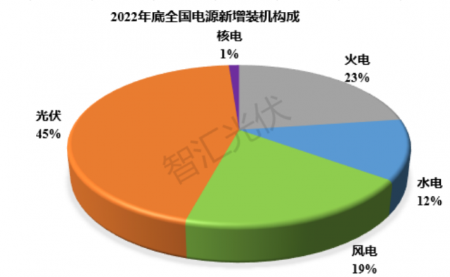 2022年,全國水電、火電、核電、風電、光伏的裝機容量分別新增2387萬千瓦、4471萬千瓦、227萬千瓦、3763萬千瓦和8741萬千瓦,合計19974萬千瓦。2022年,各類電源新增裝機結構如下圖所示。