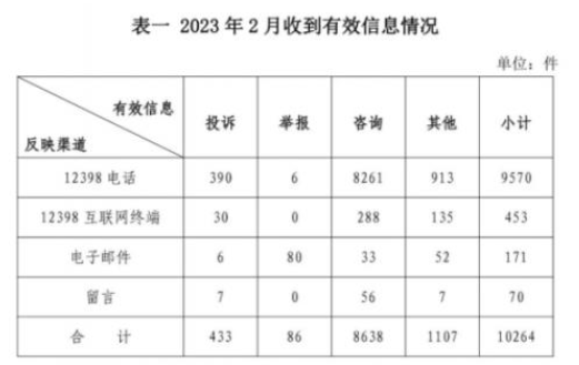 2023年2月,國家能源局12398能源監(jiān)管熱線(以下簡稱12398熱線)共收到有效信息10264件(包含投訴、舉報(bào)、咨詢和其他訴求類別),環(huán)比減少27.07%,同比增加22.69%。(2023年2月收到有效信息情況見表一)