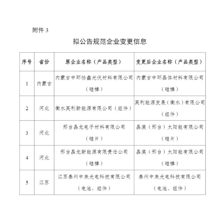 京瓷(天津)太陽(yáng)能有限公司等14家已公告企業(yè),因不能保持規(guī)范條件要求,擬撤銷(xiāo)其規(guī)范企業(yè)資格(見(jiàn)附件2);內(nèi)蒙古中環(huán)協(xié)鑫光伏材料有限公司等5家企業(yè)名稱(chēng)發(fā)生變更,擬更新有關(guān)公告信息(詳見(jiàn)附件3),以上信息一并予以公示。