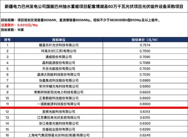 記者了解到,上述采購項目的投標(biāo)企業(yè)共有16家,11家企業(yè)報出了高于或與0.69元/W持平的價格。其中,隆基綠能旗下的隆基樂葉給出了0.7574元/W的最高報價,一道新能的報價為0.69元/W,與協(xié)會最近一次發(fā)布的組件成本價一致。