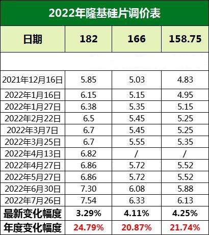 本網(wǎng)訊 7月26日,隆基股份公布了最新一期的硅片價格,與最近一次(6月30日)的硅片價格相比,158.75尺寸硅片漲4.25%,定價為6.13元/W;166尺寸硅片漲4.11%,定價為6.33元/W;182尺寸硅片漲3.29%,定價為7.54元/W。與上次調(diào)價相比,本次隆基股份調(diào)漲幅度明顯收窄。