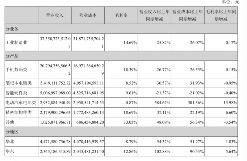 具體到欣旺達(dá)旗下各大業(yè)務(wù)分類,欣旺達(dá)的業(yè)務(wù)主要是消費(fèi)電子類業(yè)務(wù)(包括手機(jī)數(shù)碼類、筆記本電腦類和智能硬件類)和汽車及動(dòng)力電池類業(yè)務(wù)組成。而目前欣旺達(dá)的總體收入主要來源依然是消費(fèi)電子業(yè)務(wù),2021年實(shí)現(xiàn)營(yíng)業(yè)收入312.16億元,同比增長(zhǎng)16%,占比達(dá)到83.57%,其中手機(jī)數(shù)碼類的毛利率維持在18.39%,近3年變化不大。