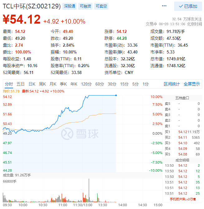 6月28日,TCL中環(huán)(SZ:002129)午后強(qiáng)勢漲停,股價報54.12元/股,總市值達(dá)到1749億元,距離歷史前高56.13元/股僅有咫尺之遙!自4月27日低點以來,公司股價漲幅達(dá)到61%!