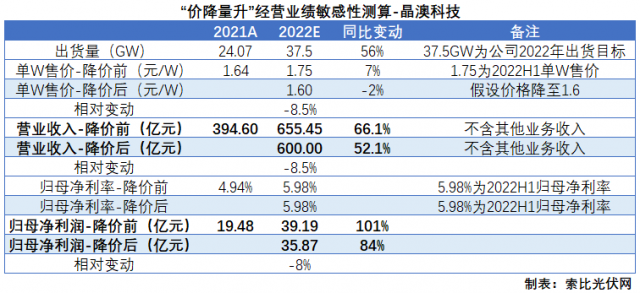 首先來看愛旭股份,假設2022年電池片單W售價下降至2020年的水平,同時盈利能力恢復至同期水平,按照全年出貨30GW計算,則營收規(guī)模相比于降價前下降27%,營收增速由89.7%下降至39.1%。不過,受益于盈利能力的修復,經(jīng)營業(yè)績暴增1556%,相較于降價前的960%大幅提升。