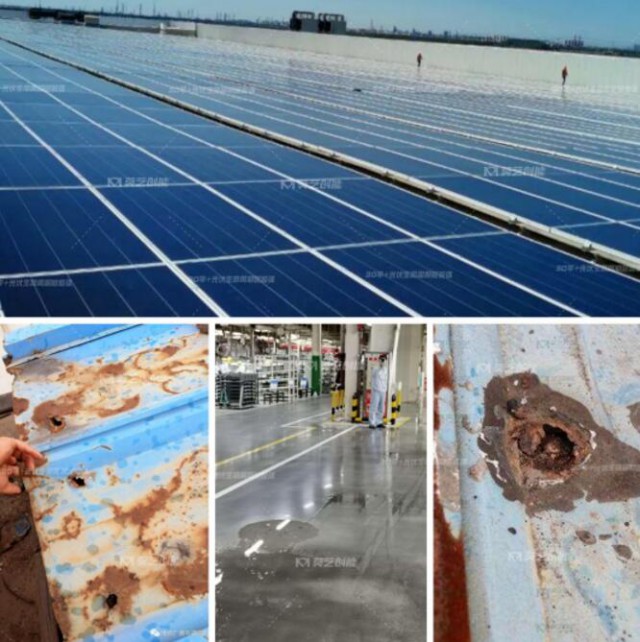 若只依靠彩鋼瓦本身的屋面,很容易因為涂層厚度不夠,加之紫外線、雨水、光合作用等自然因素的侵蝕,造成屋面彩鋼瓦接縫處開裂、鉚釘松動生銹、屋面銹蝕擴(kuò)大、瓦脊銹蝕銹穿導(dǎo)致屋面出現(xiàn)滲水漏水的情況。同時因其坡度小,可能會造成雨水排泄不暢、積水超過彩鋼瓦接縫高度或鉚釘孔高度及溝沿瓦而導(dǎo)致銹損滲漏。而工廠生產(chǎn)過程中排放的酸性、堿性等氣體長期與屋面接觸,也會腐蝕鋼結(jié)構(gòu),加速銹蝕、穿孔導(dǎo)致滲漏。