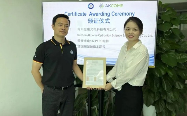 碳中和作為人類應(yīng)對氣候變化的共識,受到世界各國的廣泛關(guān)注,越來越多的國際市場推出碳相關(guān)的綠色認證準入要求。法國是歐洲市場較早提出針對光伏組件碳足跡要求的國家,擁有特有的流程和成熟的政策框架。此次愛康光電獲得的法國碳足跡ECS證書,取得了近400kg eq CO2/kWc的碳值表現(xiàn),在業(yè)內(nèi)極具競爭力,對于愛康光電的產(chǎn)品推廣與法國市場布局具有極其重要的戰(zhàn)略意義。