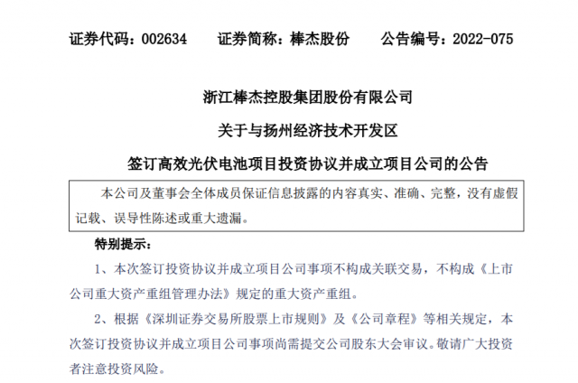 棒杰股份表示結(jié)合自身戰(zhàn)略轉(zhuǎn)型優(yōu)勢及我國光伏產(chǎn)業(yè)快速發(fā)展的機(jī)遇,依托戰(zhàn)略股東 光伏領(lǐng)域的豐富經(jīng)驗和揚(yáng)州經(jīng)濟(jì)技術(shù)開發(fā)區(qū)管委會體制創(chuàng)新、發(fā)展活力及產(chǎn)業(yè)政 策支持,投資建設(shè)10GW高效光伏電池片生產(chǎn)基地,實(shí)現(xiàn)公司主營業(yè)務(wù)向光伏業(yè)的戰(zhàn)略轉(zhuǎn)型升級,形成新的利潤增長點(diǎn),為公司業(yè)務(wù)發(fā)展提供有力支持,是公司實(shí)施戰(zhàn)略發(fā)展的重要舉措,對公司未來發(fā)展具有積極意義和推動作用。