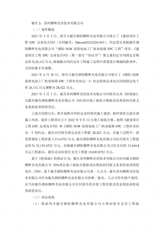 2020年~2021年期,十一科技與蘇州騰暉的六家全資子公司泗陽騰暉光電有限公司、山東騰暉新能源技術(shù)有限公司、沛縣騰暉新能源技術(shù)有限公司、宿遷騰暉新能源技術(shù)有限公司、山東騰暉光電有限公司、泗陽騰暉新能源技術(shù)有限公司簽訂了多筆項(xiàng)目施工承包合同,但上述六家企業(yè)并未全部付清工程款。