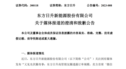 雖然朋友圈留存的時(shí)間不長(zhǎng),但其內(nèi)容還是被有關(guān)媒體捕捉到并迅速曝光。就此,東方日升于1月12日就相關(guān)媒體報(bào)道發(fā)布澄清和致歉公告,將涉及的有關(guān)言論的具體情況、公司儲(chǔ)能業(yè)務(wù)訂單情況及電池組件非硅成本情況進(jìn)行了說明。公告稱“莊英宏發(fā)布的相關(guān)言論均系其個(gè)人行為,不代表公司立場(chǎng)。”“莊英宏所述‘23年在手已簽4吉瓦時(shí)多了’為其與公司儲(chǔ)能業(yè)務(wù)相關(guān)同事交流了解后作出的個(gè)人理解,口徑為公司雙簽訂單量與意向在談?dòng)唵瘟康暮喜⒘俊?rdquo;