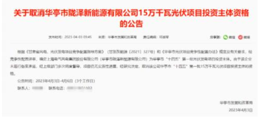 2023年4月3日華亭市發(fā)展和改革局發(fā)文,根據(jù)《甘肅省風(fēng)電、光伏發(fā)電項(xiàng)目競(jìng)爭(zhēng)配置指導(dǎo)方案》(甘發(fā)改能源〔2021〕327號(hào))和《華亭市光伏項(xiàng)目競(jìng)爭(zhēng)性配置辦法》規(guī)定及有關(guān)要求,經(jīng)競(jìng)爭(zhēng)性配置評(píng)審,確定上海電氣風(fēng)電集團(tuán)股份有限公司(華亭市隴澤新能源有限公司)為華亭市“十四五”第一批光伏發(fā)電項(xiàng)目投資主體。由于該企業(yè)未履行備案承諾,經(jīng)上級(jí)部門多次調(diào)度督導(dǎo),項(xiàng)目仍無(wú)實(shí)質(zhì)性進(jìn)展,經(jīng)研究決定,取消該公司華亭市“十四五”第一批15萬(wàn)千瓦光伏項(xiàng)目投資主體的資格。公告時(shí)間:2023年4月3日-4月6日(3個(gè)工作日)