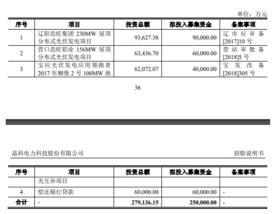晶科科技發(fā)行募集資金總額為25.98億元,募集資金凈額為24.17億元。晶科科技最終募集資金凈額比原計(jì)劃少8324.30萬元。2020年4月25日,晶科科技披露的招股說明書顯示,公司擬募集資金25.00億元,分別用于遼陽忠旺集團(tuán)230MW屋頂分布式光伏發(fā)電項(xiàng)目、營口忠旺鋁業(yè)156MW屋頂分布式光伏發(fā)電項(xiàng)目、寶應(yīng)光伏發(fā)電應(yīng)用領(lǐng)跑者2017年柳堡2號(hào)100MW漁光互補(bǔ)項(xiàng)目、償還銀行貸款。