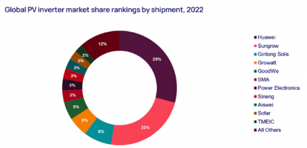 據(jù)Wood Mackenzie 公布的2022年全球逆變器市場份額Top10榜單,中國逆變器企業(yè)占據(jù)7個席位。其中,最為亮眼的是,華為位居排行榜第一,其市占率從2021年的21%提升至2022年的29%。值得一提的是,華為已實現(xiàn)連續(xù)八年市占率第一,正在“逆變”成王。