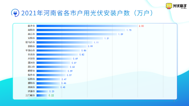 新鄉(xiāng)市是河南省戶用光伏安裝戶數(shù)最高的城市,也是戶用光伏裝機(jī)容量最高的城市,2021年全年安裝了2萬戶,447.17MW。