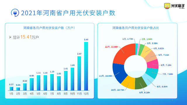 2021年河南省戶用光伏安裝了15.41萬戶,12月份安裝戶數(shù)占全年的22.66%。