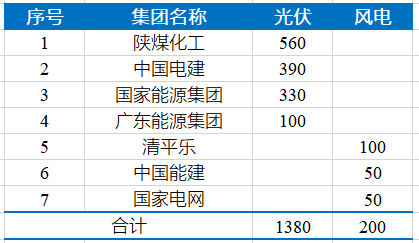 從投資企業(yè)來看,共7家企業(yè)獲得項(xiàng)目指標(biāo),其中:陜煤化工、中國電建、國家能源集團(tuán)三家均獲得300MW以上。具體如下表所示。