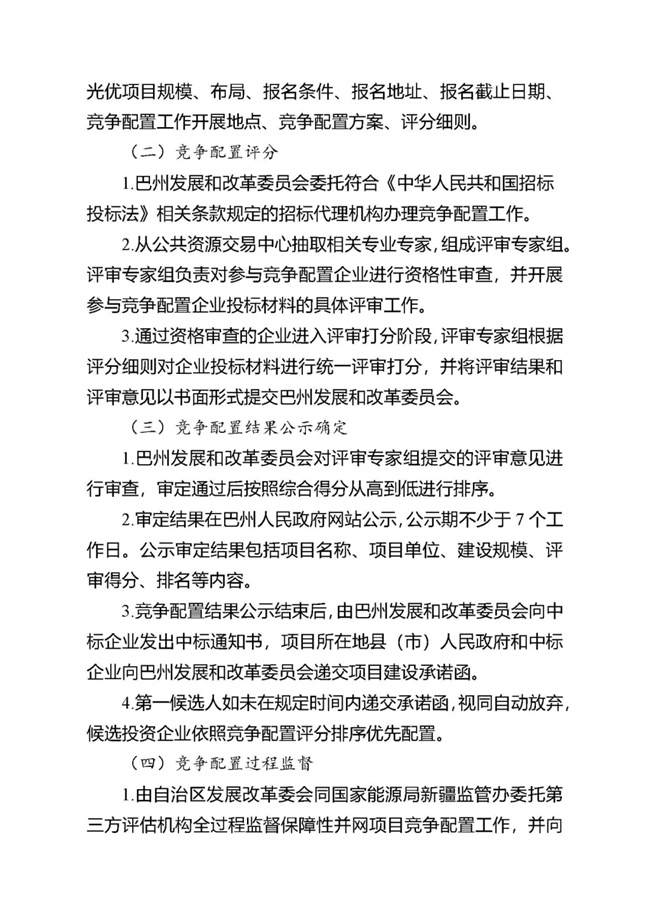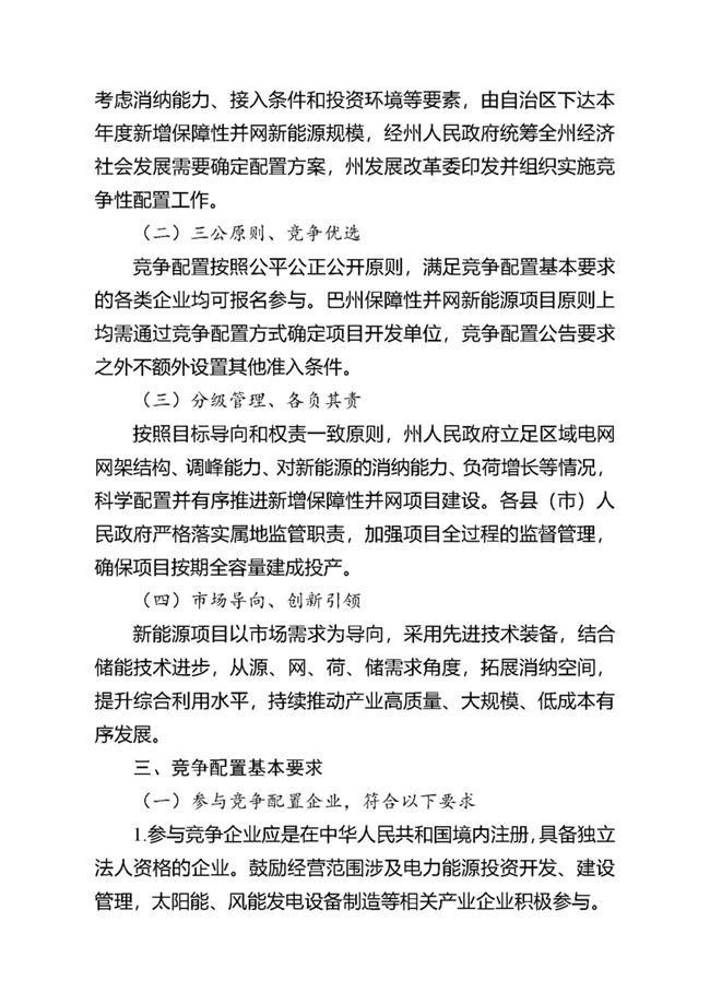 為貫徹落實(shí)碳達(dá)峰、碳中和任務(wù),持續(xù)推動巴州風(fēng)電、光伏發(fā)電高質(zhì)量發(fā)展。按照《國家能源局關(guān)于2021年風(fēng)電、光伏發(fā)電開發(fā)建設(shè)有關(guān)事項(xiàng)的通知》(國能發(fā)新能〔2021〕25號) 《新疆維吾爾自治區(qū)火電和風(fēng)電、光伏等公共資源開發(fā)建設(shè)項(xiàng)目公開招標(biāo)選定業(yè)主暫行辦法》(自治區(qū)人民政府第201號令)《自治區(qū)發(fā)展改革委國家能源局新疆監(jiān)管辦關(guān)于2021年風(fēng)電、光伏發(fā)電年度開發(fā)建設(shè)方案有關(guān)事項(xiàng)的通知》(新發(fā)改能源〔2021〕419號)等法律法規(guī)文件要求,現(xiàn)將巴州2021-2022年保障性并網(wǎng)新能源項(xiàng)目競爭性配置公開優(yōu)選業(yè)主工作公告如下: