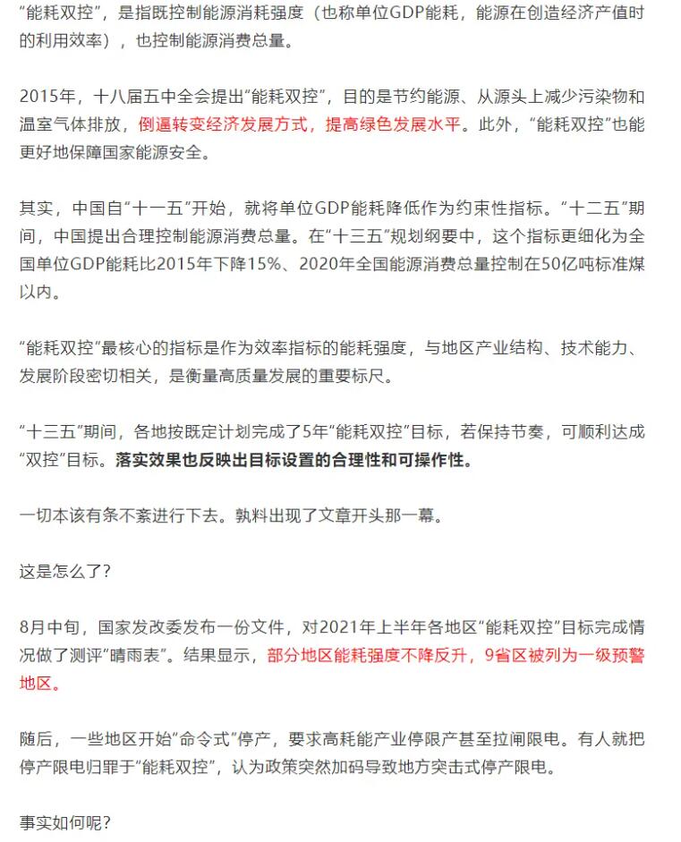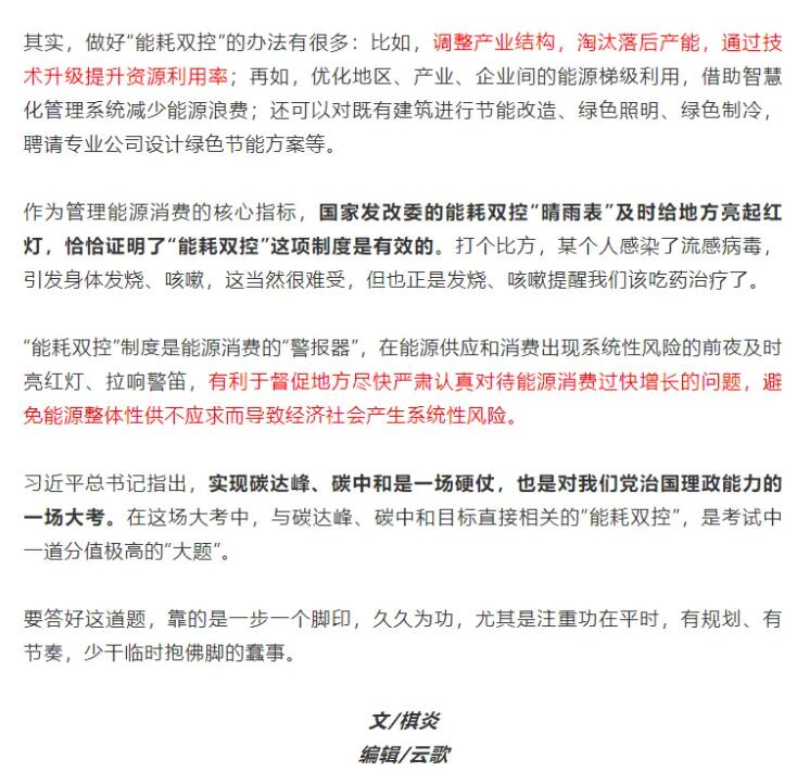 編者按:9月11日,國家發(fā)展改革委印發(fā)《完善能源消費強度和總量雙控制度方案》,要求各地政府以能源資源配置更加合理、利用效率大幅提高為導(dǎo)向,以建立科學(xué)管理制度為手段,以提升基礎(chǔ)能力為支撐,強化和完善能耗雙控制度,深化能源生產(chǎn)和消費革命,推進能源總量管理、科學(xué)配置、全面節(jié)約,推動能源清潔低碳安全高效利用,倒逼產(chǎn)業(yè)結(jié)構(gòu)、能源結(jié)構(gòu)調(diào)整,助力實現(xiàn)碳達峰、碳中和目標(biāo),促進經(jīng)濟社會發(fā)展全面綠色轉(zhuǎn)型和生態(tài)文明建設(shè)實現(xiàn)新進步。