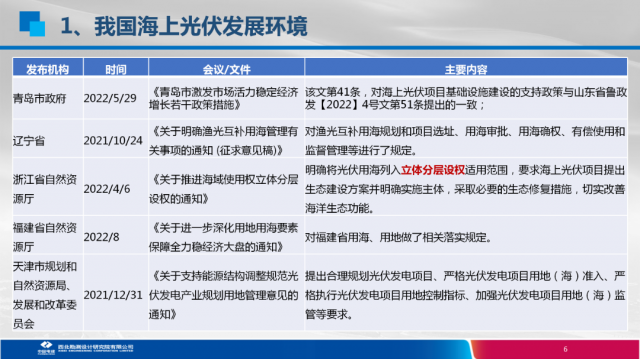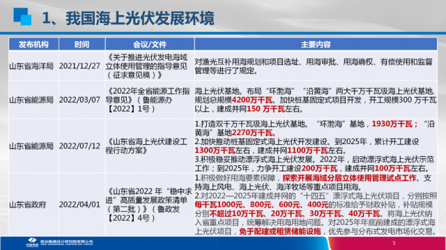 近年,隨著新能源裝機(jī)需求的增長(zhǎng)及雙碳目標(biāo)提出,山東、浙江、江蘇、福建等多個(gè)東部沿海省份由于土地稀缺,均加快布局海上光伏建設(shè),陸續(xù)出臺(tái)支持海上光伏發(fā)展的相關(guān)政策。除了分布式、大基地、海上正成為光伏應(yīng)用的重要場(chǎng)景和爭(zhēng)奪重點(diǎn)。
