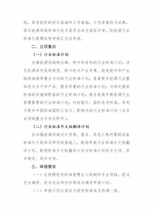 為進(jìn)一步提升能源行業(yè)標(biāo)準(zhǔn)立項(xiàng)工作的計(jì)劃性、導(dǎo)向性,根據(jù)國家能源局標(biāo)準(zhǔn)化工作安排,結(jié)合落實(shí)《能源碳達(dá)峰碳中和標(biāo)準(zhǔn)化提升行動(dòng)計(jì)劃》重點(diǎn)任務(wù),我局組織編制了《2023年能源行業(yè)標(biāo)準(zhǔn)計(jì)劃立項(xiàng)指南》?,F(xiàn)印發(fā)給你們,請(qǐng)按照指南明確的要求,做好能源行業(yè)標(biāo)準(zhǔn)計(jì)劃立項(xiàng)工作。