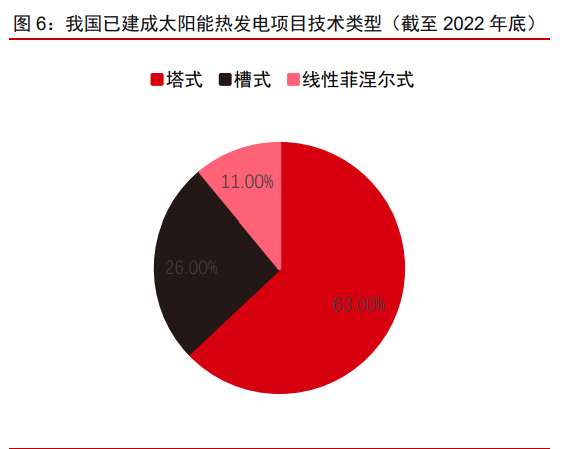 我國已建成光熱項目中,塔式光熱占比相對較高。根據(jù) CSTA 數(shù)據(jù),截至 2021 年底, 全球太陽能熱發(fā)電累計裝機(jī)容量達(dá)到 6.8GW,槽式、塔式、線性菲涅耳技術(shù)裝機(jī)在全球主 要國家和地區(qū)的占比為 76%、20%和 4%。截至 2022 年底,我國太陽能熱發(fā)電累計裝機(jī) 容量為 588MW(含 MW 級以上規(guī)模的發(fā)電系統(tǒng)),塔式光熱電站雖然前期系統(tǒng)建設(shè)一次性投資較大且維護(hù)成本較高,但更適合我國西部地區(qū)晝夜溫差大、缺少水資源、自然環(huán)境 惡劣等特點,同時因槽式系統(tǒng)和線菲式系統(tǒng)集熱效率偏低、對工質(zhì)加熱能力較弱等因素, 因而在我國塔式光熱電站應(yīng)用范圍相對較廣。