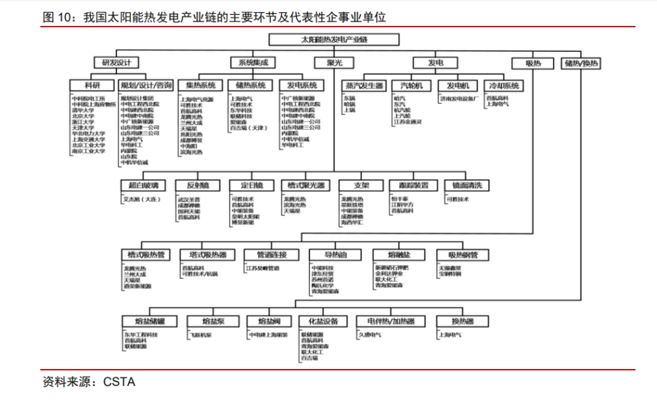 光熱發(fā)電產(chǎn)業(yè)鏈體系可分為研發(fā)、設(shè)計、制造、安裝等環(huán)節(jié),產(chǎn)業(yè)鏈國產(chǎn)化程度較高。 根據(jù) CSTA 數(shù)據(jù)顯示,在國家第一批光熱發(fā)電示范項目中,設(shè)備、材料國產(chǎn)化率超過 90%, 技術(shù)及裝備的可靠性和先進(jìn)性在電站投運(yùn)后得到有效驗證;在青海中控德令哈 50MW 塔 式光熱發(fā)電項目中,設(shè)備和材料國產(chǎn)化率已達(dá)到 95%以上。