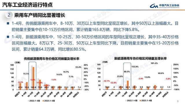 1-4月,傳統(tǒng)能源乘用車中,8-10萬(wàn)、30萬(wàn)以上車型同比呈現(xiàn)正增長(zhǎng),其中50萬(wàn)以上漲幅最大。目前銷量主要集中在10-15萬(wàn)價(jià)格區(qū)間,累計(jì)銷量165.8萬(wàn)輛,同比下降5.8%。