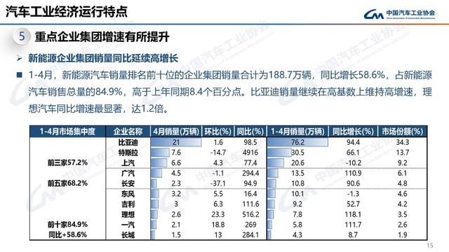 新能源企業(yè)集團(tuán)銷量同比延續(xù)高增長(zhǎng)。1-4月,新能源汽車銷量排名前十位的企業(yè)集團(tuán)銷量合計(jì)為188.7萬(wàn)輛,同比增長(zhǎng)58.6%,占新能源汽車銷售總量的84.9%,高于上年同期8.4個(gè)百分點(diǎn)。比亞迪銷量繼續(xù)在高基數(shù)上維持高增速,理想汽車同比增速最顯著,達(dá)1.2倍。
