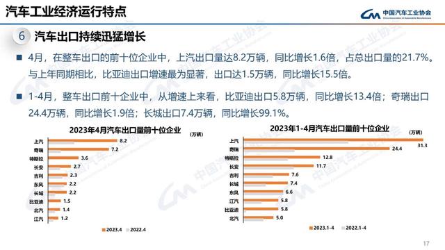 六是汽車出口持續(xù)迅猛增長(zhǎng)。4月,汽車企業(yè)出口37.6萬(wàn)輛,環(huán)比增長(zhǎng)3.3%,同比增長(zhǎng)1.7倍。分車型看,乘用車本月出口31.6萬(wàn)輛,環(huán)比增長(zhǎng)3.7%,同比增長(zhǎng)2.2倍,商用車出口6萬(wàn)輛,環(huán)比增長(zhǎng)1.2%,同比增長(zhǎng)41.6%。新能源汽車出口10萬(wàn)輛,環(huán)比增長(zhǎng)28.6%,同比增長(zhǎng)8.4倍。