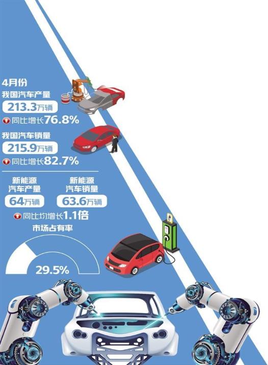 伴隨宏觀經(jīng)濟持續(xù)恢復向好,市場需求逐步回暖,汽車消費需求有望進一步釋放。中汽協(xié)發(fā)布數(shù)據(jù)顯示,4月份,我國汽車產(chǎn)銷分別完成213.3萬輛和215.9萬輛,同比分別增長76.8%和82.7%。其中,新能源汽車產(chǎn)銷和汽車出口延續(xù)良好態(tài)勢。