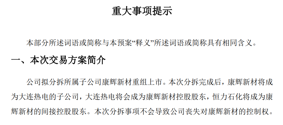 千億民營(yíng)石化巨頭擬分拆康輝新材與大連熱電重組上市。7月4日,恒力石化發(fā)布公告稱,擬分拆所屬子公司康輝新材重組上市。