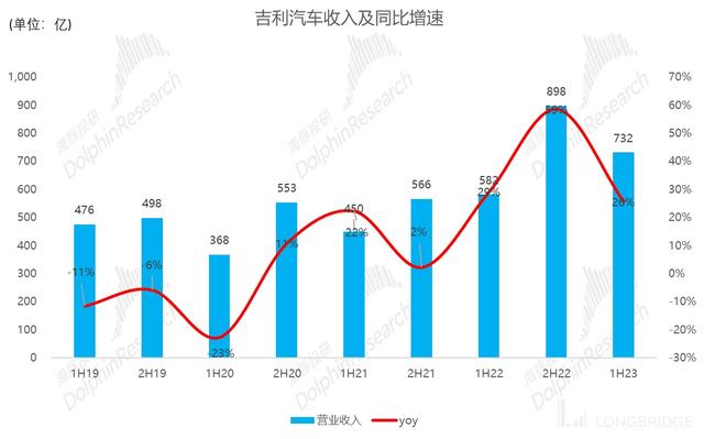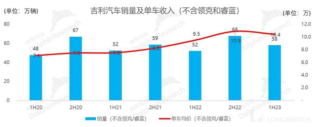 根據(jù)海豚君計算,公司 2023 年上半年實現(xiàn)單車收入(不含領(lǐng)克和睿藍(lán))10.4 萬元,同比增 10%,超出市場預(yù)期 9.2 萬元。